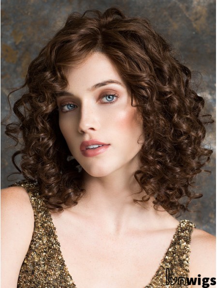 This is a mid-length, curly human hair wig with fullness and body. The 100% Remy Human Hair is pre-curled and consists of a 50/50 blend of Chinese and Indian hair, processed to keep the integrity and shine. You can style the hair straight, curly, or wavy.