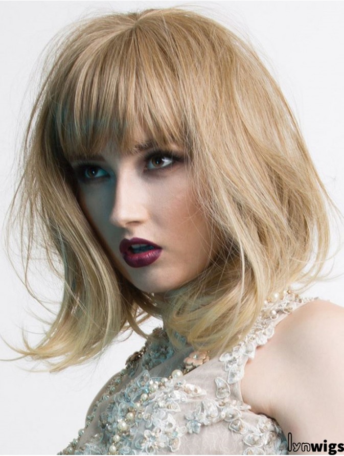 Shoulder Length With Bangs 14 inch Wavy Blonde Medium Wigs